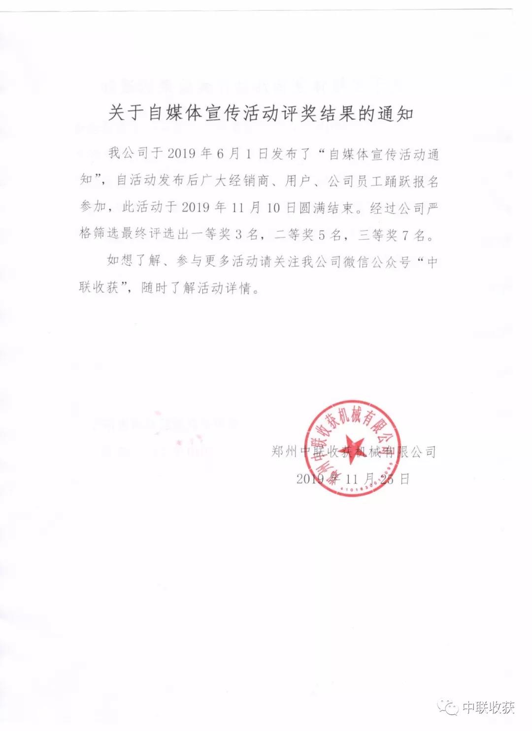 中聯收獲公司關于自媒體宣傳活動評獎結果通知