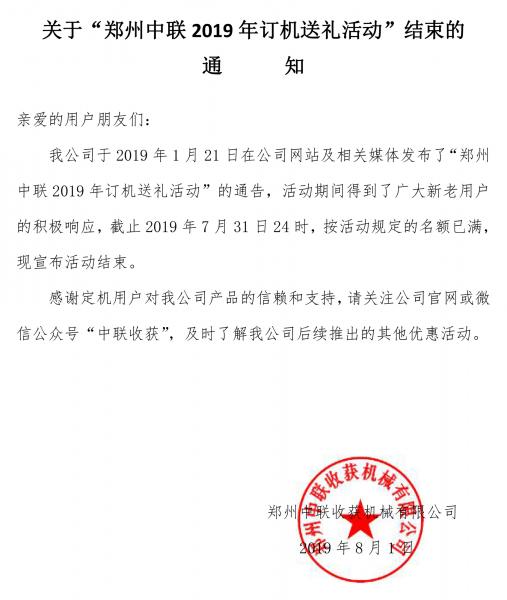 關于“鄭州中聯 2019 年訂機送禮活動” 結束的通知